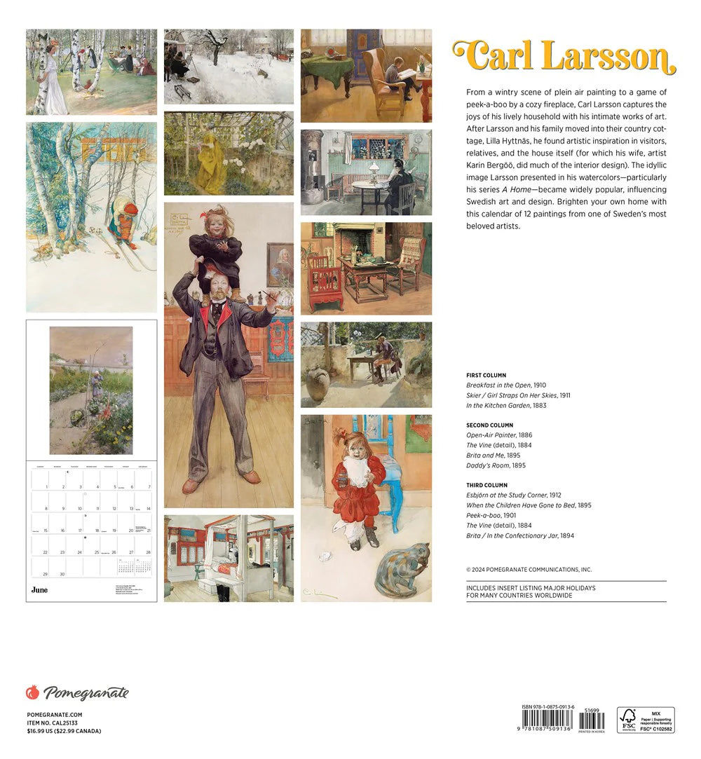 From a wintry scene of plein air painting to a game of peek-a-boo by a cozy fireplace, Carl Larsson captures the joys of his lively household with his intimate works of art. After Larsson and his family moved into their country cottage, Lilla Hyttnäs, he found artistic inspiration in visitors, relatives, and the house itself (for which his wife, artist Karin Bergöö, did much of the interior design). The idyllic image Larsson presented in his watercolors—particularly his series A Home—became widely popular, influencing Swedish art and design. Brighten your own home with this calendar of 12 paintings from one of Sweden’s most beloved artists.