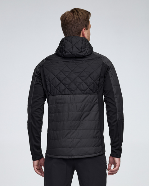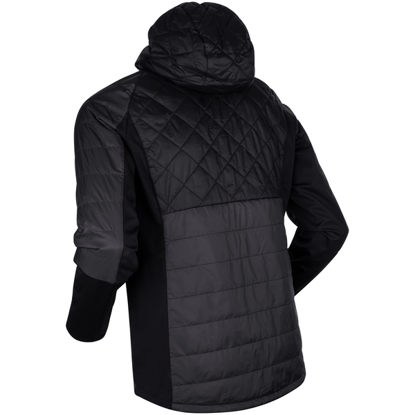 Jacket Graphlite is a lightweight outdoor jacket with a hood, perfect before and after exercise or as a leisure jacket. The Bionic Finish Eco® technology used on the fabric's surface ensures that light rain and sleet bounce off. This is a quilted jacket that provides good insulation, feels full, and stays lump-free after washing. A high collar and shaped hood provide extra warmth and comfort. The front zipper zips right up with chin protection from the fleece. The elastic 3-layer soft shell panels in the side and under the arms provide good mobility and ventilation. Two zippered hand pockets.