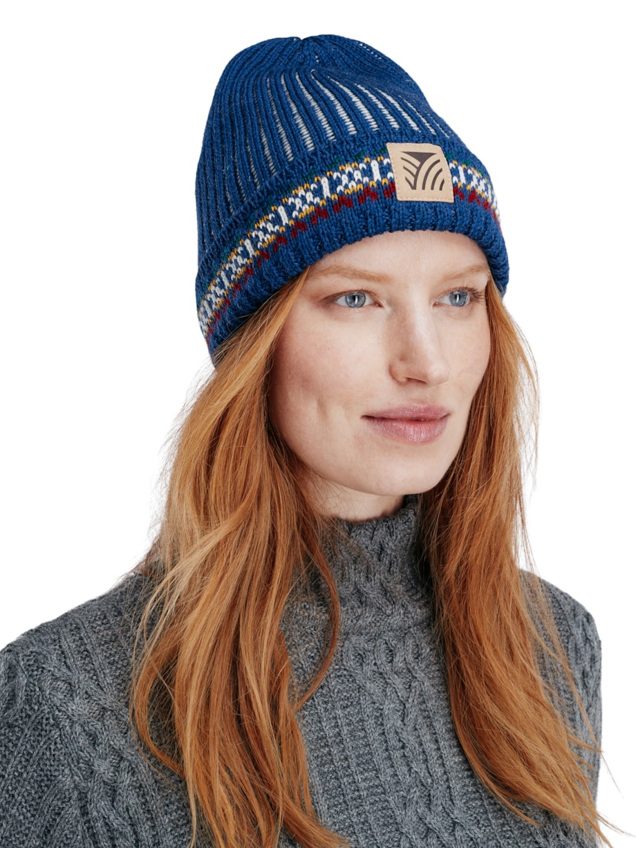 A rib-knitted hat with a detailed border around the fold up hem, knitted with a double-knit construction. The patterned border on the hat has been taken from one of Dale of Norways greatest successes ever: our official Olympic sweater from the Winter Olympics in Lillehammer in 1994.