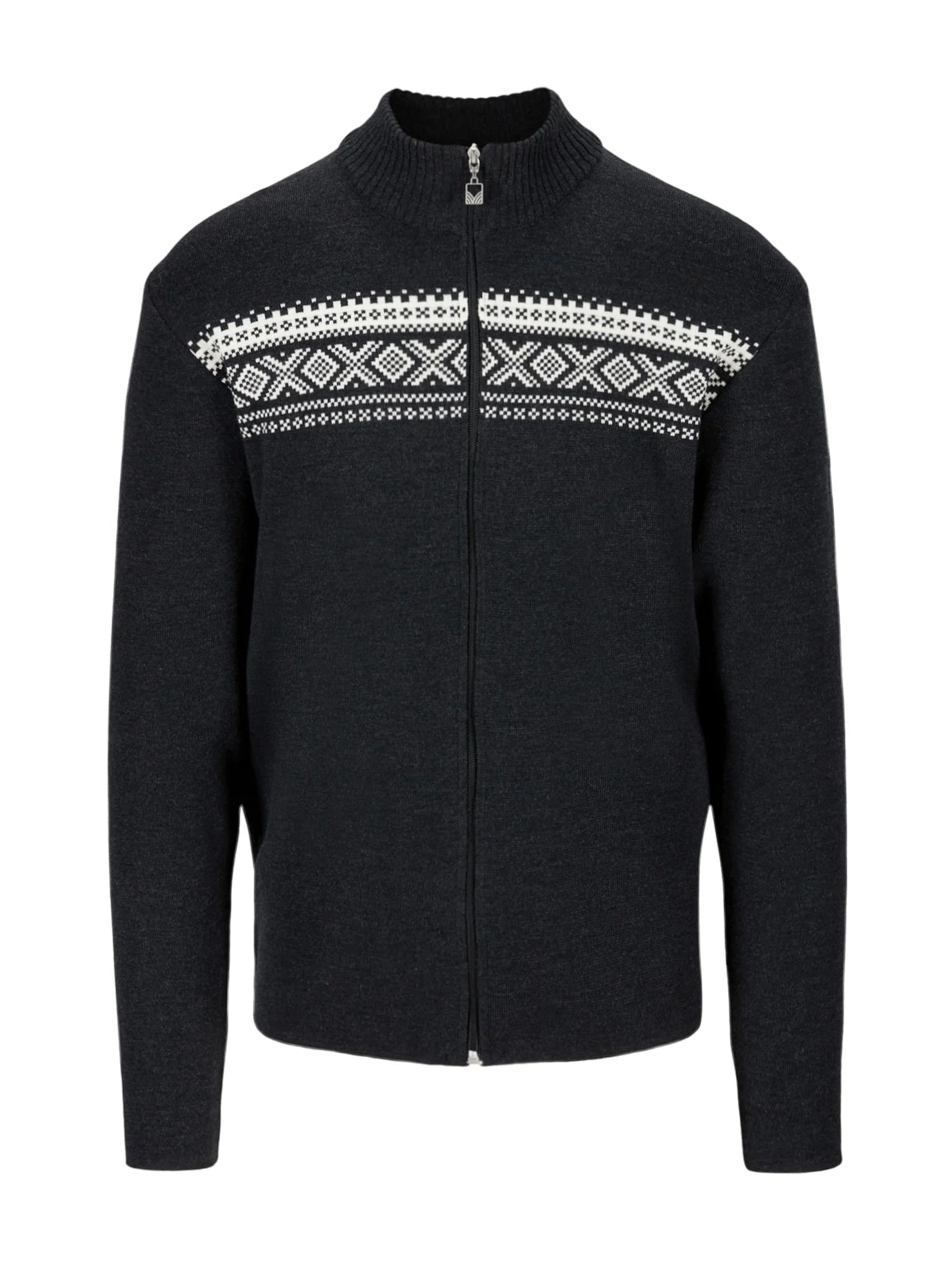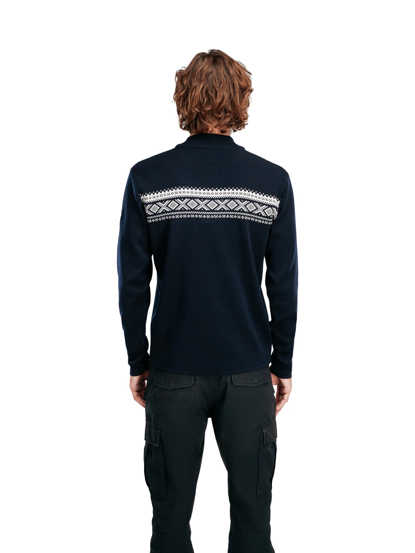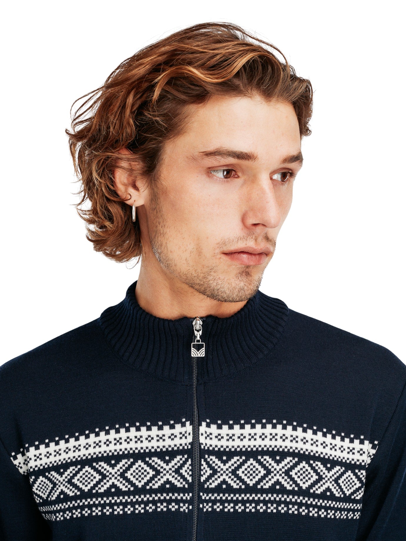 The Dalestølen merino wool jacket is a lighter and sportier version of the iconic Cortina 1956 sweater. The jacket is made of 100% soft merino wool. The sweater has an updated version of the Cortina pattern, with a high neck and zipper.