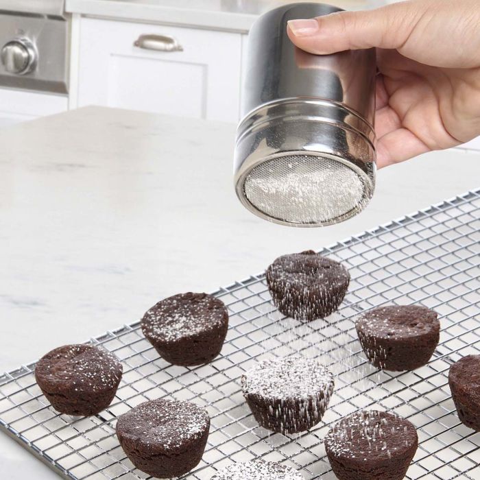 - Fine mesh screen lid dusts powdered sugar, flour, cinnamon, cocoa, and other finely textured ingredients