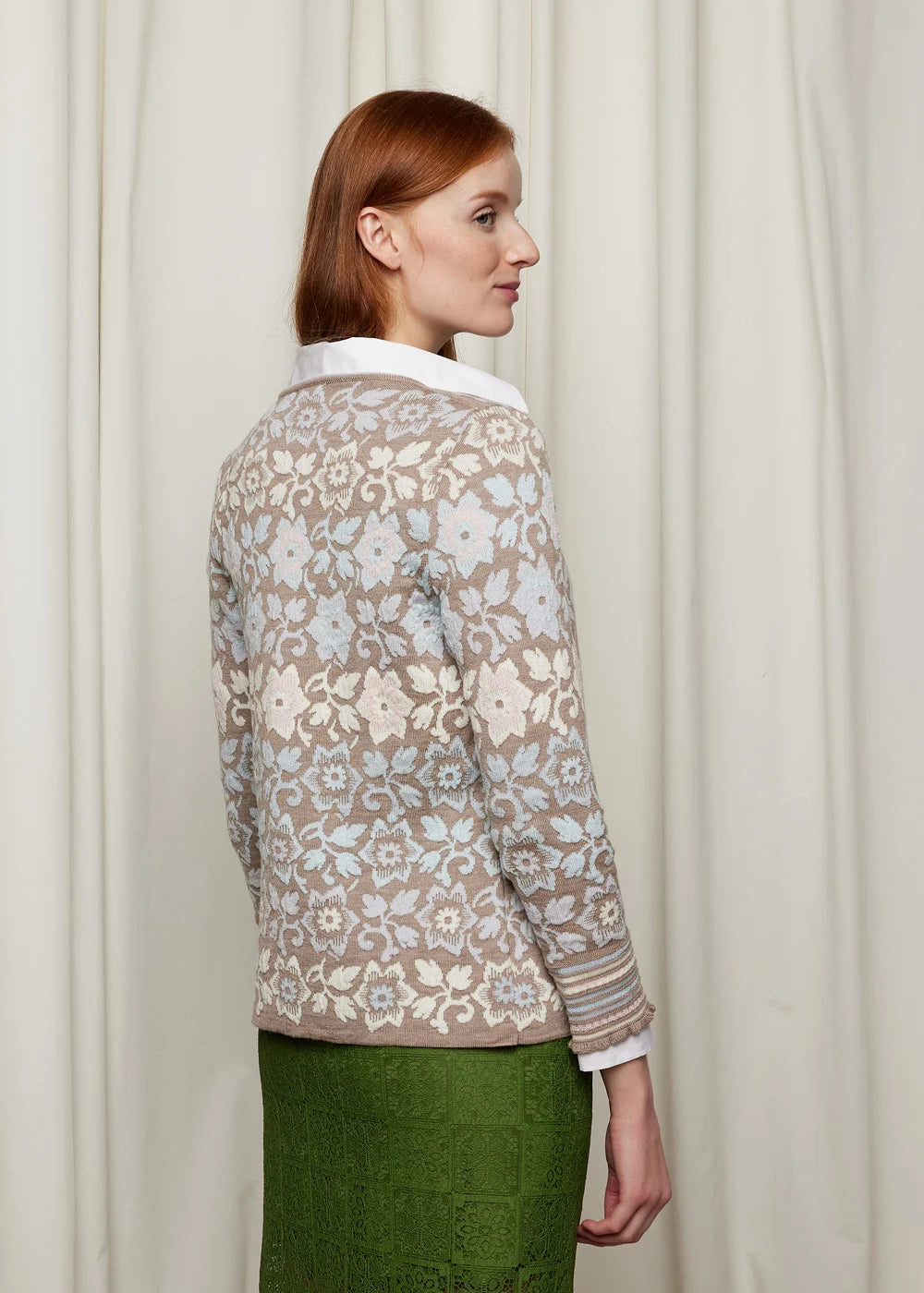 Mid length cardigan, with a straight classical shape. The pattern is inspired from an old indian textile, woven to the japanese marked. Fits perfectly over a silk blouse or one of our knitted tops.