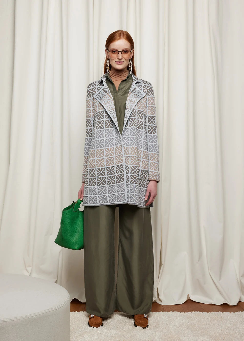 Long cardigan with geometric pattern inspired by portuguese tiles. It has a three dimensional knitted structure and colour shifts. Comfortable and easy to wear for almost any occation.