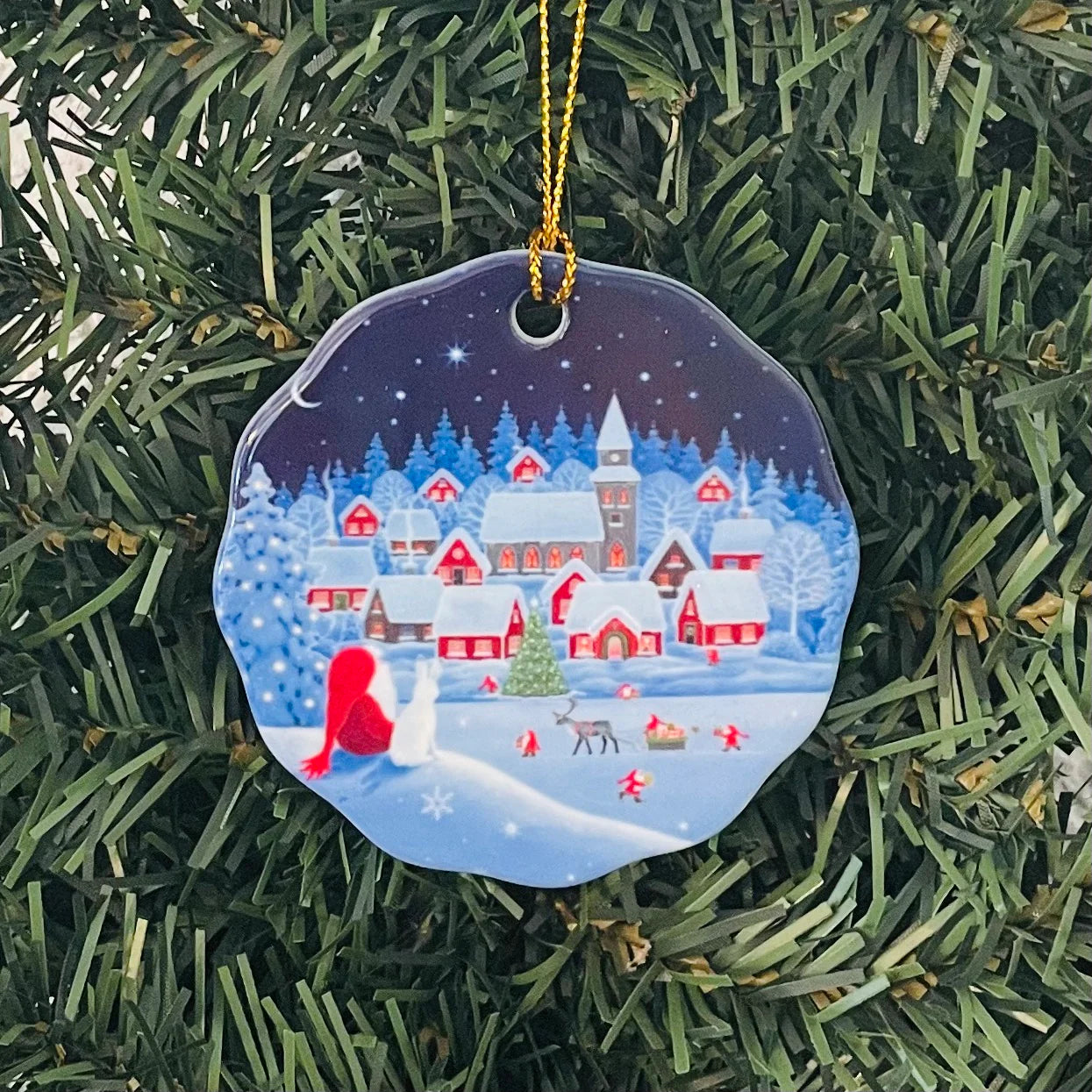 Ceramic Ornament Eva Melhuish Tomte & Rabbit Watching Village