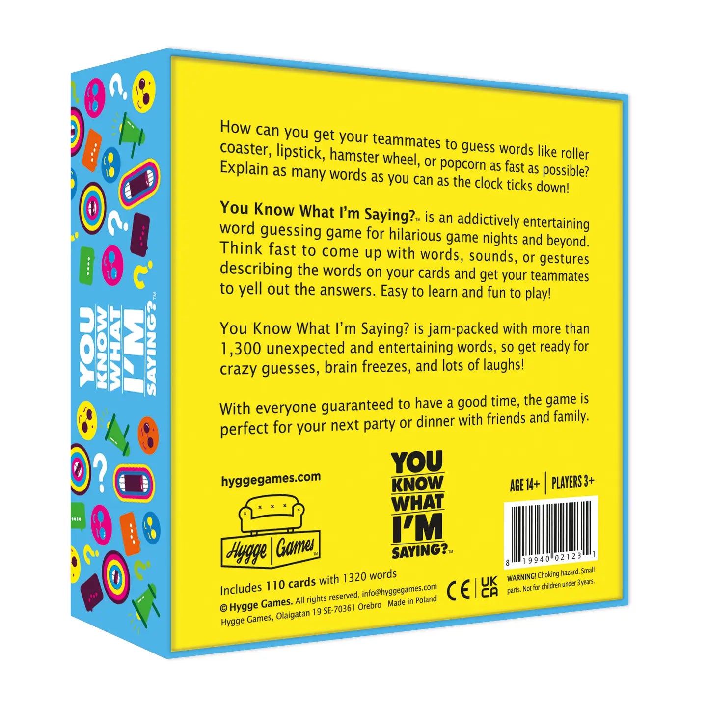 You Know What I’m Saying? is an addictively entertaining word guessing game for hilarious game nights and beyond. Think fast to come up with words, sounds, or gestures describing the words on your cards and get your teammates to yell out the answers. Easy to learn and fun to play!